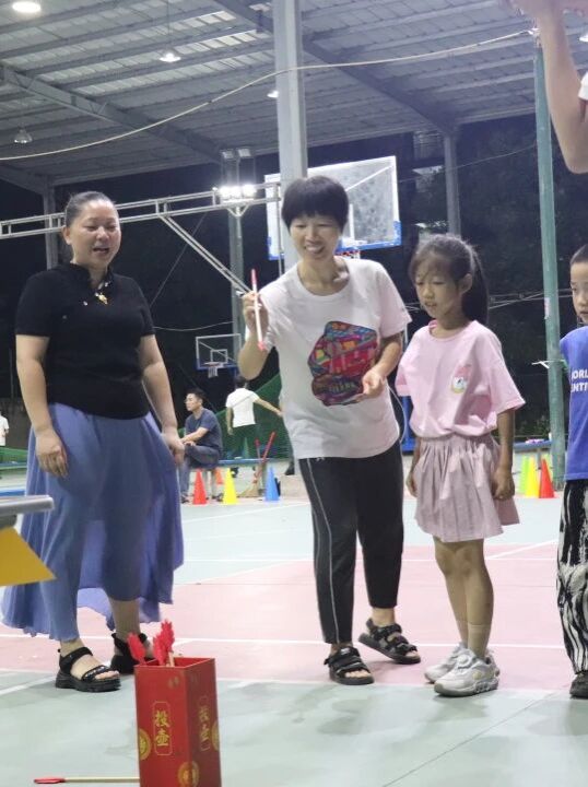 运动会以“民族体育+亲子互动”为核心,设置踢毽子、跳绳、珠行万里等六大趣味站点。在踢毽子区,家长与孩子接力踢毽,五彩毽球在空中飞舞,默契配合引来阵阵欢呼;滚铁环赛道上,小朋友手持铁钩小心翼翼绕过障碍物,家长在旁加油呐喊,铁环滚动的哗啦声与笑声交织成夏日乐章。投壶站点更是人气爆棚,家长与孩子屏息凝神投掷箭矢,当箭支落入圆筒时,现场爆发出热烈掌声。每个游戏通关后,小朋友都能在奖品兑换卡上收集小红花,这份“荣誉勋章”成为他们挑战自我的最佳见证。