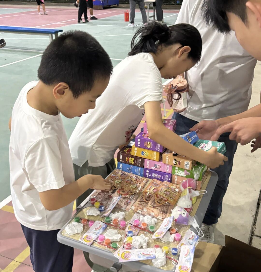 运动会特设趣味奖励机制:集齐2-5个小红花可兑换文具套装、彩绘石膏、积木玩具等精美奖品。闭营仪式后,孩子们高举盖满印章的兑换卡奔向奖品领取处,拿到心仪礼物时的灿烂笑容,为这场夏日狂欢画上温馨注脚。家长们纷纷表示:“第一次和孩子一起玩滚铁环、踢毽子,仿佛回到童年,既锻炼了身体,又让孩子感受到传统体育的魅力。”