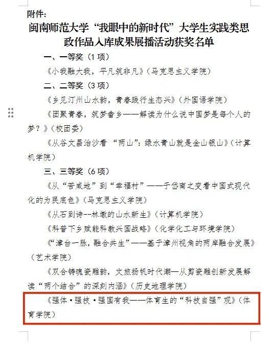 为深入学习贯彻习近平新时代中国特色社会主义思想,引导青年学子坚定理想信念、厚植家国情怀,近日,校“我眼中的新时代”大学生思政作品征集活动评选结果揭晓。我院学子以作品《强体·强技·强国有我——体育生的“科技自强”》,成功斩获三等奖,充分展现了我院学子的独特视角与青春担当,以及他们对新时代思政内涵的深刻理解与积极践行。