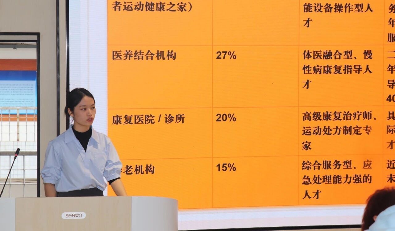 10位选手站上决赛舞台,他们分别以乡村体育教师、健身教练、花样跳绳教师、老年人康复师等不同职业目标对自己的职业规划展开叙述,既展现了当代大学生对职业领域的多元认知——从传统行业深耕到新兴领域探索,覆盖范围广且贴合时代趋势;也体现了他们将个人兴趣、专业优势与社会需求深度结合的思考能力,打破了单一职业路径的局限,彰显出主动规划人生的独立意识与前瞻视野。