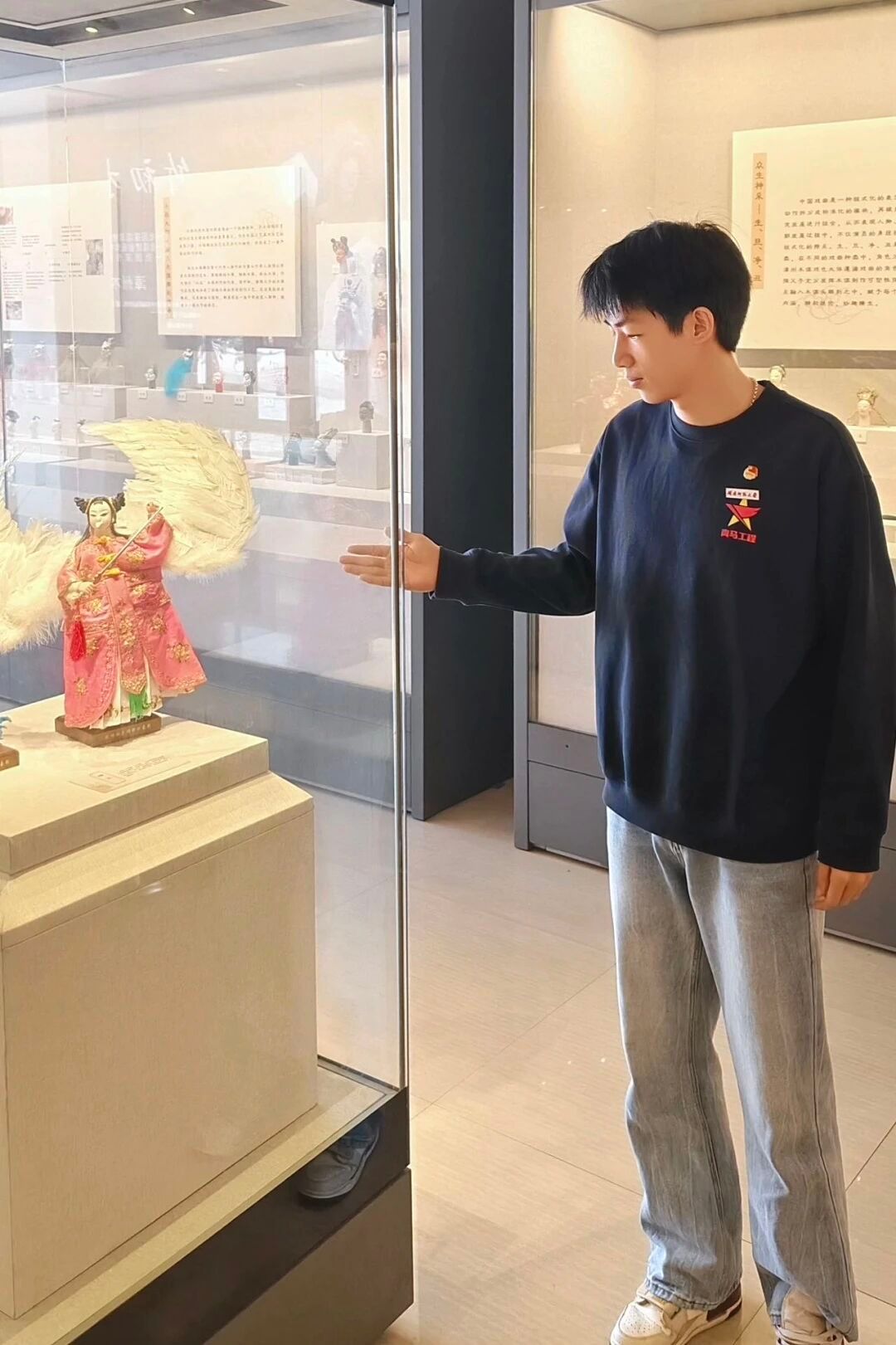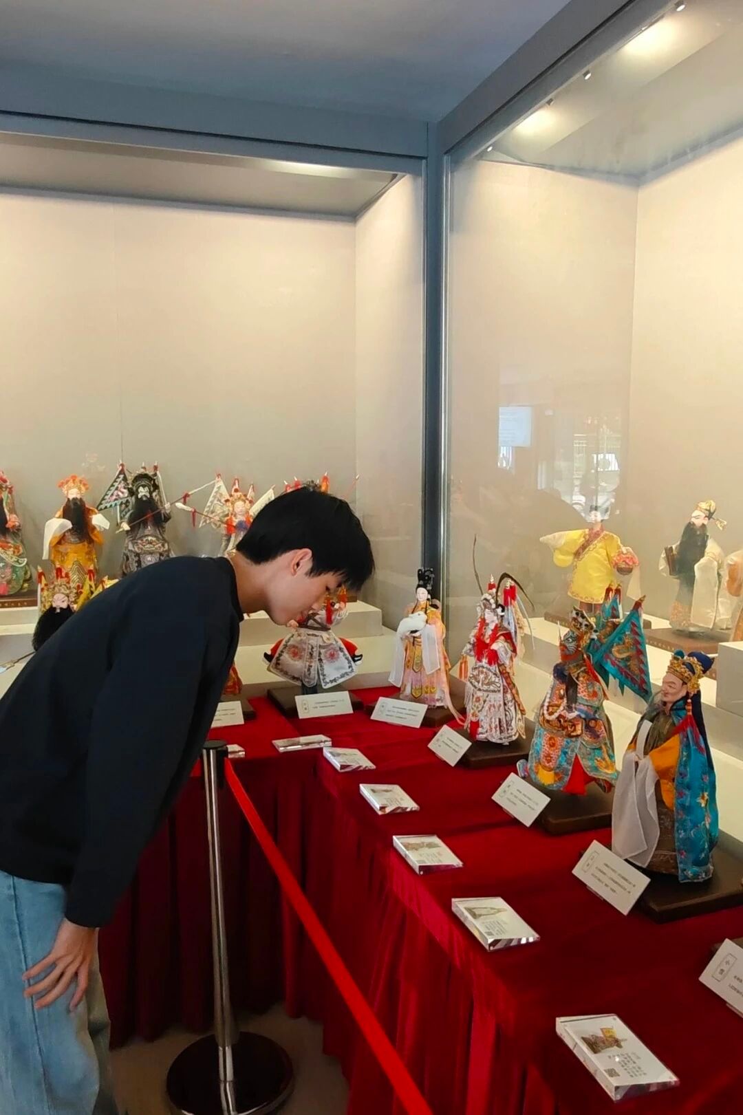 此外,实践队成员们还主动请教场馆讲解员,围绕"闽台非遗传播脉络""两岸技艺同源特征"展开深度访谈,询问南音"指谱"如何随闽南移民传入台湾并发展出独特流派,了解提线木偶戏在两岸节庆民俗中的共同演绎形式,探讨梨园戏"十八步科母"与台湾歌仔戏身法的传承关联等。实践队成员们认真记录讲解员的口述史料,拍摄珍贵文献与实物展品,系统梳理闽台非遗同根同源的核心资料,为后续研究积累素材。