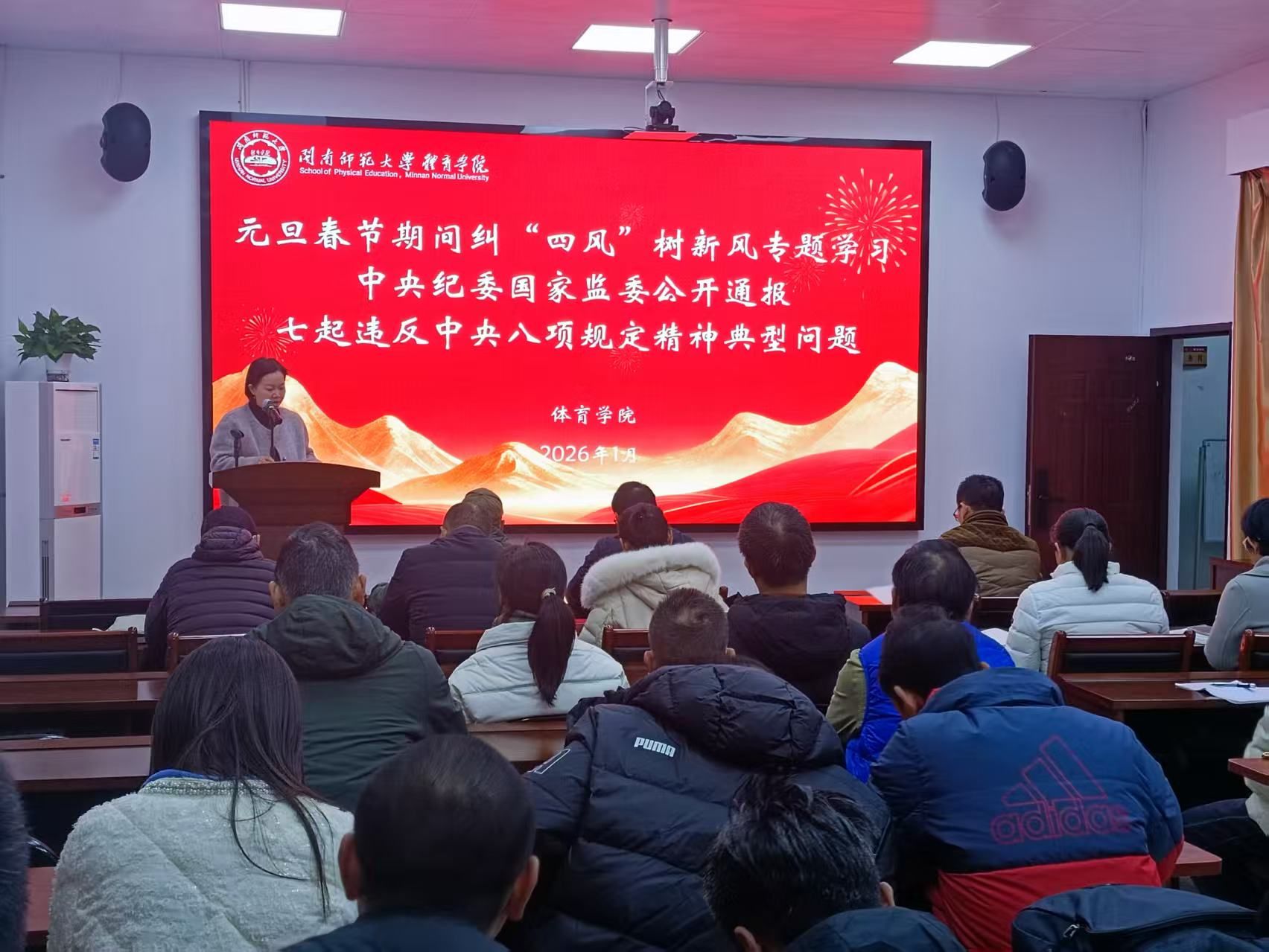 最后,杨俊敏副院长(主持行政工作)代表学院作2025年度工作总结,从党建工作、科研平台建设、人才队伍培养、课程建设、体育项目培训、社会服务等多个维度全面回顾了学院一年来的工作成果与亮点。杨院长在总结讲话中,对全体教职工的辛勤付出表示感谢,并围绕“双一流”专业建设与科研业绩核心任务,对学院未来发展进行了规划部署,号召全院教职工凝心聚力、砥砺奋进,共同推动学院事业再上新台阶。